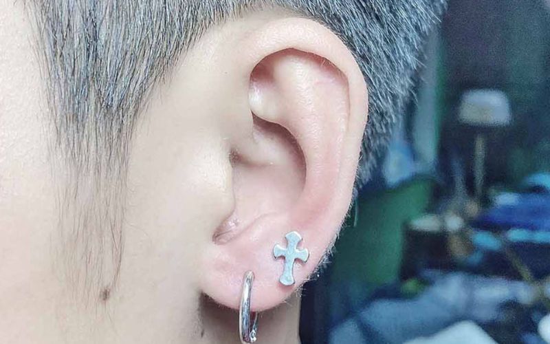 Khuyên tai chữ thập là một trong những mẫu khuyên tai nam được nhiều anh chàng cá tính lựa chọn. Với dáng khuyên tai dài, mẫu này mang đến sự ấn tượng mạnh mẽ và nam tính. Đặc biệt, hình thánh giá, chữ thập đeo trên tai tạo điểm nhấn độc đáo và đầy phá cách. Mẫu khuyên tai này không chỉ tôn thêm góc cạnh cho khuôn mặt mà còn thể hiện phần nào về tinh thần và niềm tin của đấng mày râu.
