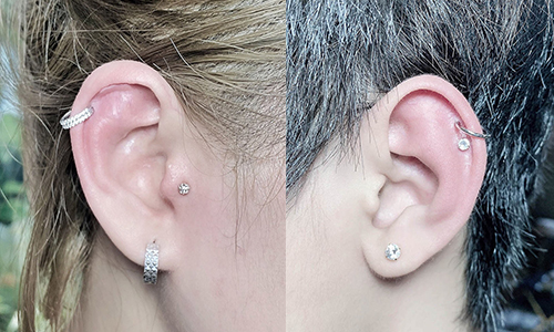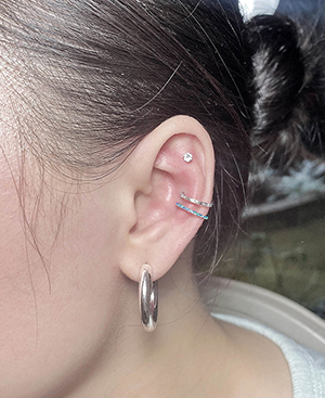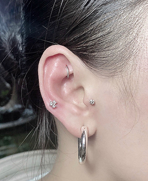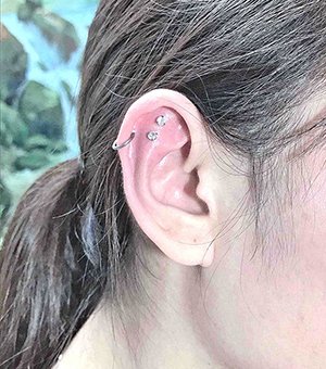 Xỏ khuyên tai Helix với 1 khuyên đá và 1 khuyên tròn kết hợp