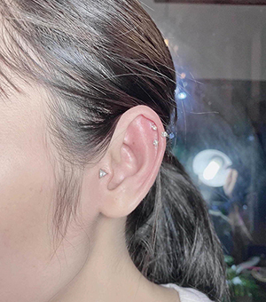 Ở phần mềm tai thì bạn có thể chọn xỏ 1, 2 hoặc 3 lỗ để có thể phối hợp khuyên một cách uyển chuyển, cực kỳ bắt mắt bạn nhé. 3 lỗ thành hàng thẳng hay tạo thành 1 hình tam giác, kết hợp khuyên tròn hoặc khuyên đầu đính đá đều rất đẹp.